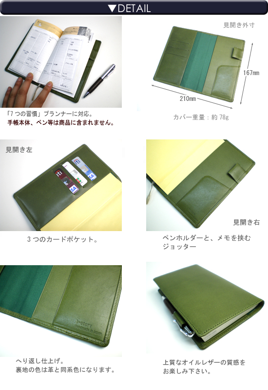 栃木レザー製の手帳カバーです。外装の他、手帳の表紙を差し込むポケット類にも栃木レザーを使っており本革ならではの味わい深い表情と、経年変化によるエイジングをお楽しみ頂けます。手間のかかる「ヘリ返し」で細部までしっかりと作り込み、上品さと機能性を併せ持つワンランク上のカバーに仕上げています。革が馴染んで柔らかくなった段階でも表紙としての強度を保つよう内部に芯材入れており、裏地にはなめらかで滑りの良いシャンタン布地を使用しています。部分的に最適な厚みに漉き(すき)加工を施した革を使用するなど細かな手間を加える事で、手帳をセットしたその日からストレスなくご使用頂けるカバーとなっています。レザーの存在感を生かしたシンプルでスタンダードなデザインは男性、女性、年齢を問わず広くご使用頂けるものです。内側にはペンホルダーの他に、カードポケットやジョッター(メモはさみ)を装備しており、名刺、カード、チケット、書類などの収納に便利です。さらにオプションで名入れ刻印、ベルト、栞(しおり)、バタフライストッパー等を追加したり、ツートンにカラー変更ができたりとお好みでカスタマイズが可能です。あなただけのオリジナルカバーの作成はもちろんのこと、大切な人へのギフト用としてもおすすめの商品です。