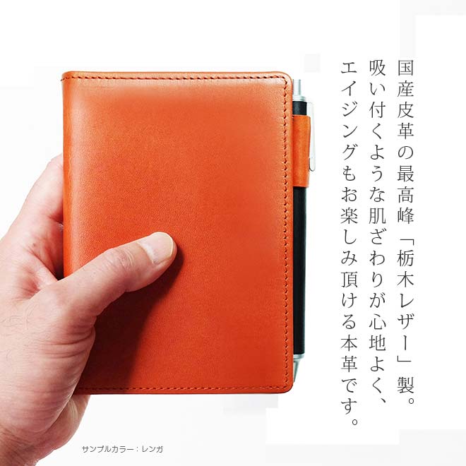 栃木レザー製の手帳カバーです。外装の他、手帳の表紙を差し込むポケット類にも栃木レザーを使っており本革ならではの味わい深い表情と、経年変化によるエイジングをお楽しみ頂けます。手間のかかる「ヘリ返し」で細部までしっかりと作り込み、上品さと機能性を併せ持つワンランク上のカバーに仕上げています。革が馴染んで柔らかくなった段階でも表紙としての強度を保つよう内部に芯材入れており、裏地にはなめらかで滑りの良いシャンタン布地を使用しています。部分的に最適な厚みに漉き(すき)加工を施した革を使用するなど細かな手間を加える事で、手帳をセットしたその日からストレスなくご使用頂けるカバーとなっています。レザーの存在感を生かしたシンプルでスタンダードなデザインは男性、女性、年齢を問わず広くご使用頂けるものです。内側にはペンホルダーの他に、カードポケットやジョッター(メモはさみ)を装備しており、名刺、カード、チケット、書類などの収納に便利です。さらにオプションで名入れ刻印、ベルト、栞(しおり)、バタフライストッパー等を追加したり、ツートンにカラー変更ができたりとお好みでカスタマイズが可能です。あなただけのオリジナルカバーの作成はもちろんのこと、大切な人へのギフト用としてもおすすめの商品です。